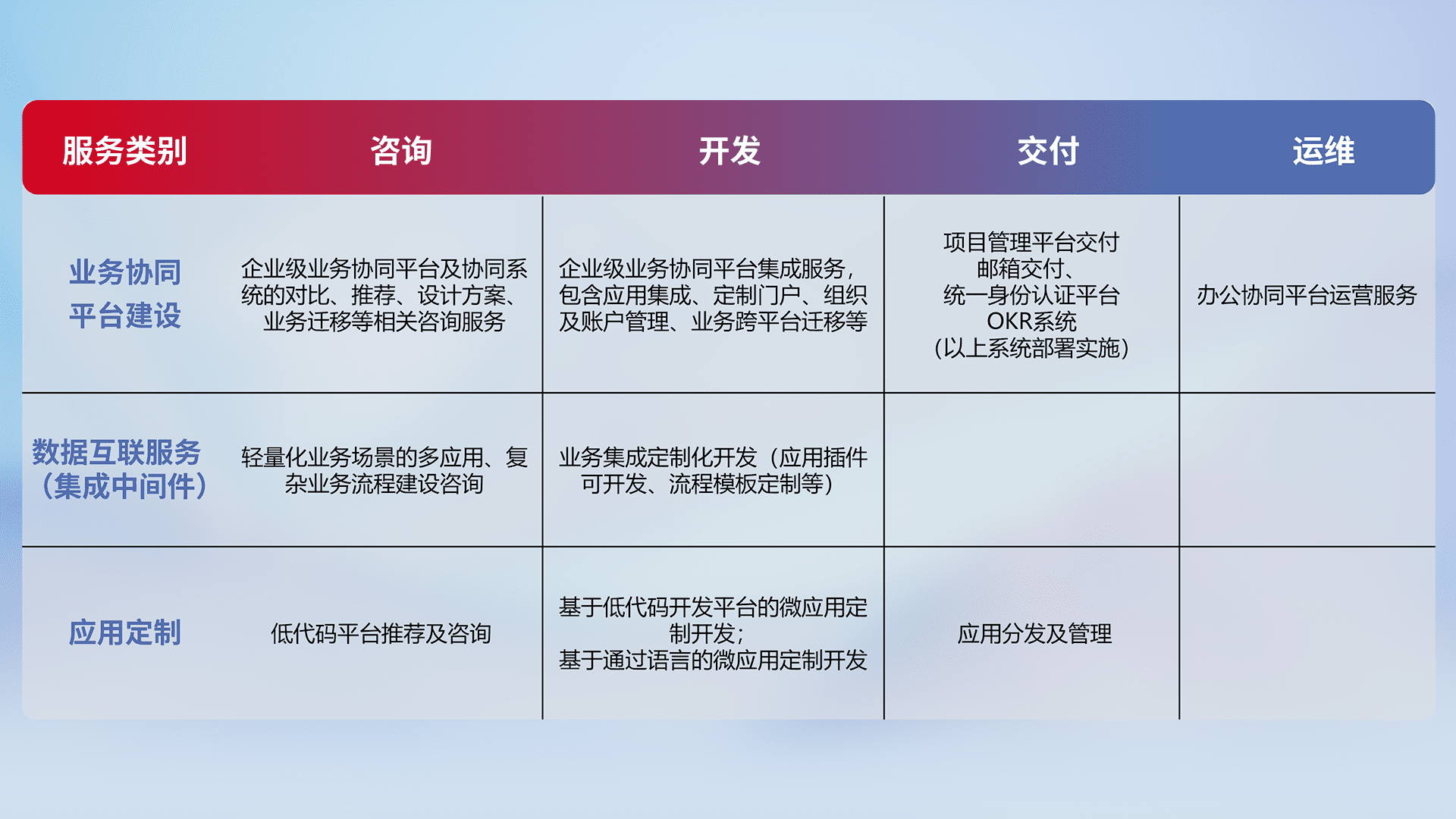 针对钉钉、、、企微、、、IDaas等平台级产品提供产品的规划、、、方案、、、交付、、、定制化开发等服务,,,实现如统一协同办公、、智能客户服务、、、、混合会议管理、、、智能数据查询、、等业务场景,,实现数字化转型。。